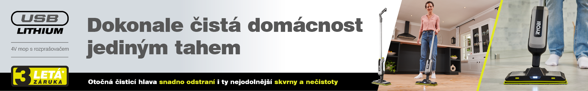 USB Lithium™ 4V akumulátorový mop s rozprašovačem bez námahy vytře rozlité tekutiny a špinavé skvrny z tvrdých podlah.