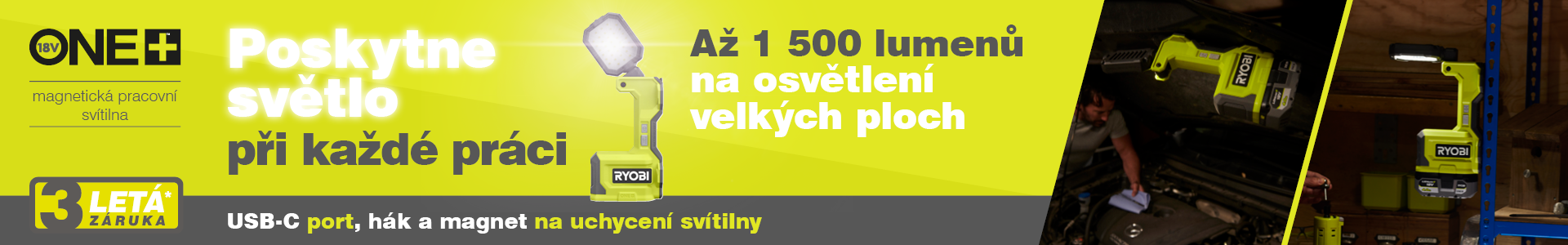 18V ONE+™ magnetická pracovní svítilna od RYOBI® je vhodná na nabíjení a osvětlení prostoru.