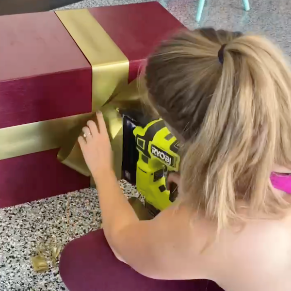 Stuhu kolem krabice připevněte za pomocí 18V ONE+™ akumulátorové 15G hřebíkovačky. Uprostřed vytvořte mašli a připevněte ji sešívačkou.